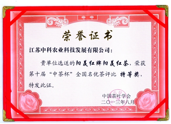 近日,从中国茶叶协会传来喜讯,继2011年获得中国茶叶协会举办的“中茶杯”全国名优茶评比“一等奖”后,由阳羡茶文化生态园选送的“阳羡红”牌阳羡红茶在来自全国18个产茶省市、地区选送的164个红茶样品中脱颖而出,获最高奖项——特等奖。 “中茶杯”全国名优茶评比由中国茶叶学会主办,每两年举办一次,代表了全国名优茶评比的最高水平,最高奖项为特等奖。历年来,阳羡茶文化生态园高度重视茶叶的生产制作,每年年初都制订详细的采摘、生产计划,对茶叶的采摘、制作工艺、制作流程的控制都实行严格把关,不断提高产品档次,突出公司特色。2013年通过引进制茶专业技术人员,改进制茶工艺,生产出的茶叶无论是从外观、汤色、香气还是口感都比往年提高了许多,在2013年湖父镇举办的新茶开采节及第一届斗茶大赛上都获得好评。
