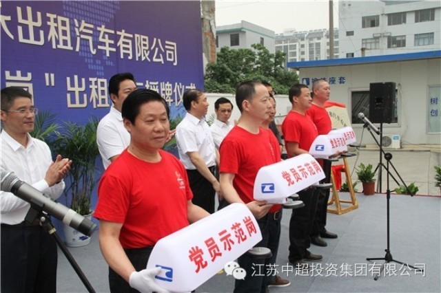 2015年5月24日,上午9时18分,中超利永出租汽车有限公司举行了揭牌暨“党员示范岗”出租车授牌仪式。仪式由中超利永出租汽车有限公司总经理范汉祥主持,市政府何晓进副市长,市委组织部何涛副部长,市交通运输局何忠局长,中超集团杨飞董事长,还有来自市政府办公室、市财政局、公安局、行政执法局、市交通运输局、运管处、出租车管理办公室等行业主管部门的领导,以及中超集团公司相关领导及各子公司董事长、总经理等领导出席了该揭牌仪式。 成立仪式上,杨飞董事长首先致辞感谢各位领导和社会各界的支持,并表示出租车公司将严格落实行业管理规定和要求,以加强安全运营和服务管理为重点, 以为市民提供安全、快捷、规范、优质的出行服务为宗旨,以提升宜兴城市文明形象为己任,切实履行和勇于承担企业的社会使命。引领出租车管理新模式,实习分级分类管理,致力于打造出租车行业新名牌,同时强调“党员示范岗” 出租车驾驶员代表要充分发挥党员的先锋模范作用。 市政府何市长,市交通运输局何忠局长先后致贺词。他们在讲话中,对新公司的成立表示热烈的祝贺,希望公司按照现代企业管理的要求,实行规范化管理、标准化服务,将出租车“党员示范岗”打造成窗口中的亮点,以一流的服务带动我市的出租车行业再上新台阶。 随后何市长、杨飞董事长为新公司揭牌。随着鲜红的幕布落下,公司总经理范汉祥作出了承诺,中超利永出租汽车有限公司将不负各级领导的重望,以优质的服务回报社会,为提升宜兴城市文明形象贡献出力量。仪式在热烈的掌声中接近尾声,最后由各位领导为“党员示范岗”驾驶员代表授牌,小小的牌子背后是一份荣誉,一份使命,更多是一份责任,希望我们的“党员示范岗”驾驶员代表,能够珍惜荣誉,牢固树立服务意识,增强责任感、充分发挥好示范带头作用。