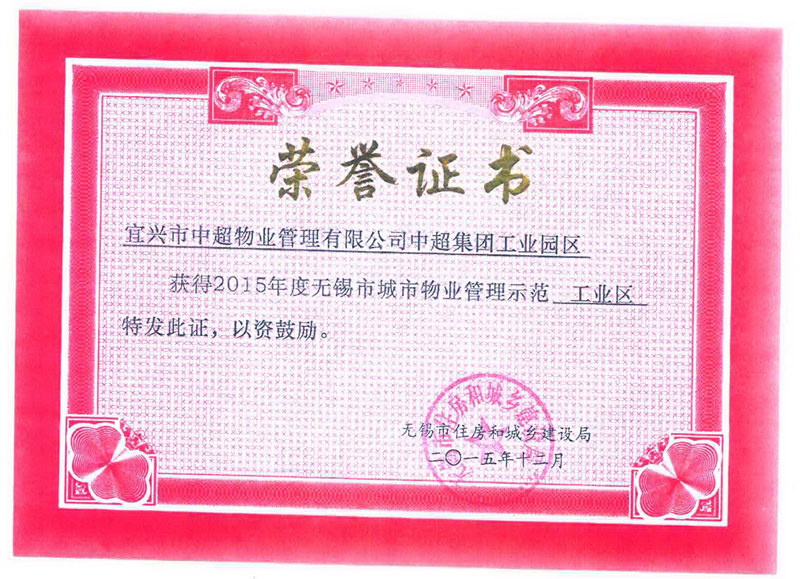 2015年3月根据无锡市住房局锡房物业(2015)1号、2号文件通知精神,中超物业管理有限公司开展了“物业管理服务达标”活动,“中超集团工业园区”被评选为无锡市物业管理示范项目(平安小区)。