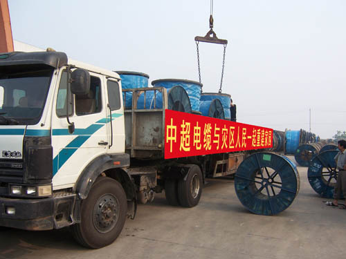 大地震造成了灾区基础设施大面积瘫痪,作为电线电缆制造企业,中超电缆以良好信誉、优良品质取得了驰名商标的美誉,综合现今灾区重建最极缺的物资等方面考虑,公司决定以自己生产的品牌电缆向灾区人民送去温暖。在生产任务及其紧张的同时,生产部全体员工加班加点,为赈灾电缆一路开绿灯,于6月2日第一批价值135余万元的赈灾电缆装车发往四川重灾区,其他批次正在加班加点赶制中。