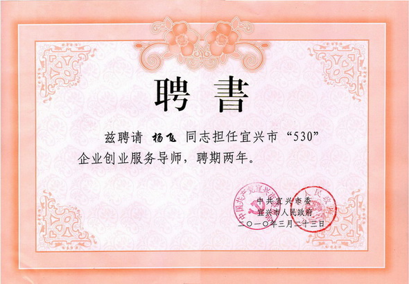 3月23日,在我市高层次创新创业人才座谈会上,公司董事长杨飞被聘为宜兴市“530”企业创业服务导师。市委常委、组织部部长李江为杨飞颁发了聘书。副市长王华良主持了会议。