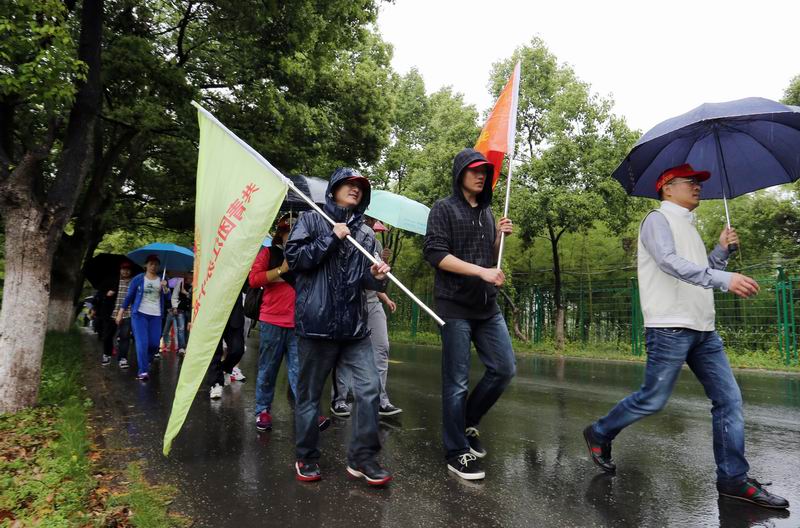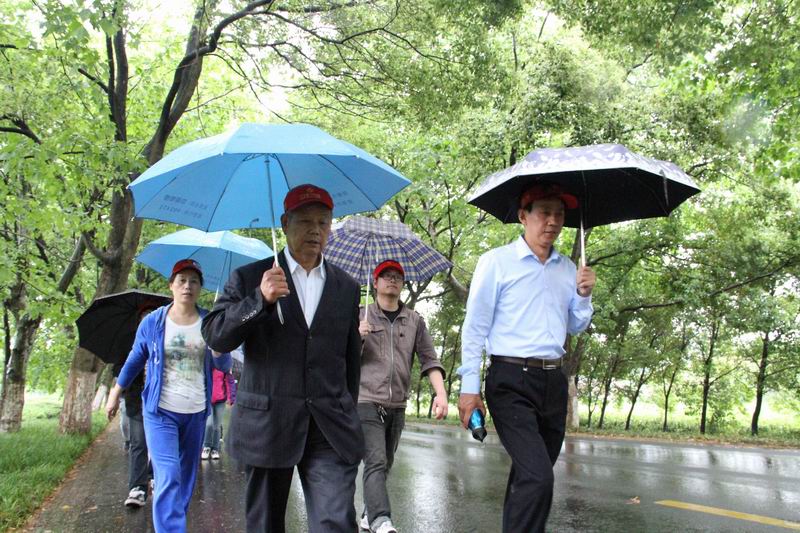 在简短的启动仪式后,大家兴趣盎然踏上征程。上午9点,在丁张公路路口, 60余人排着整齐的队伍,冒着稠密的细雨,迈着坚定的步伐,开始了本次的徒步活动。只见领导们一马当先,走在队伍前列,而青年也不甘示弱,在团旗的引领下紧紧跟随。行走途中,虽然大家脸上满是雨水,衣服淋湿了,鞋子浸水了,但是大家依然步履矫健,意志坚定,勇往直前,向着目标迈进。行进途中,有的同志高唱革命歌曲进行鼓劲,让感到疲惫的队员,重拾力量,坚持向前,大家也合声共唱,真是一路走来一路歌,成为雨中一道靓丽的风景线。队伍中有两位特殊的人,那是我们的医务保障,他们虽然年逾七十,但是“老骥伏枥志在千里”,始终走在队伍的前列,让我们青年感到“汗颜”,无形中也激励着我们不断前行……