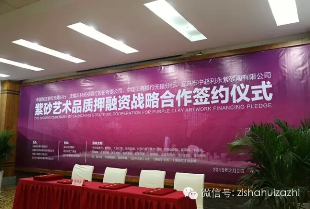 2月2日下午,由中国民生银行无锡分行、无锡农村商业银行股份有限公司、中国工商银行无锡分行、宜兴市中超利永紫砂陶有限公司主办的紫砂艺术品质押融资战略合作签约仪式,在宜兴市阳羡茶文化生态园茶博馆举行。