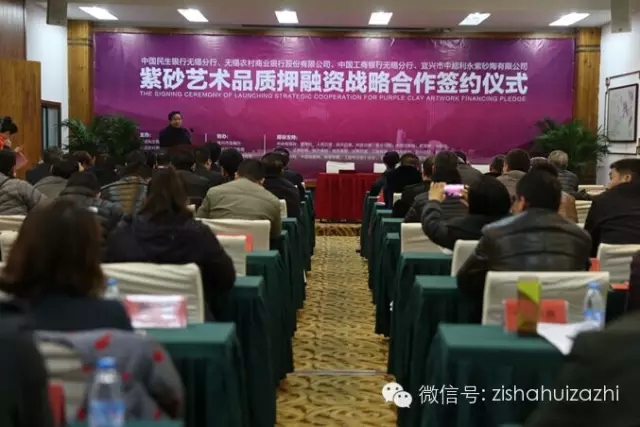此次活动由宜兴市文广新局局长许夕华全程主持。在与会嘉宾共同见证下,三大合作银行领导与宜兴市中超利永紫砂陶有限公司总经理沈映斌共同启动签约仪式。合作双方秉承政府大力推动文化产业发展思想,推动紫砂文化产业的可持续健康发展。