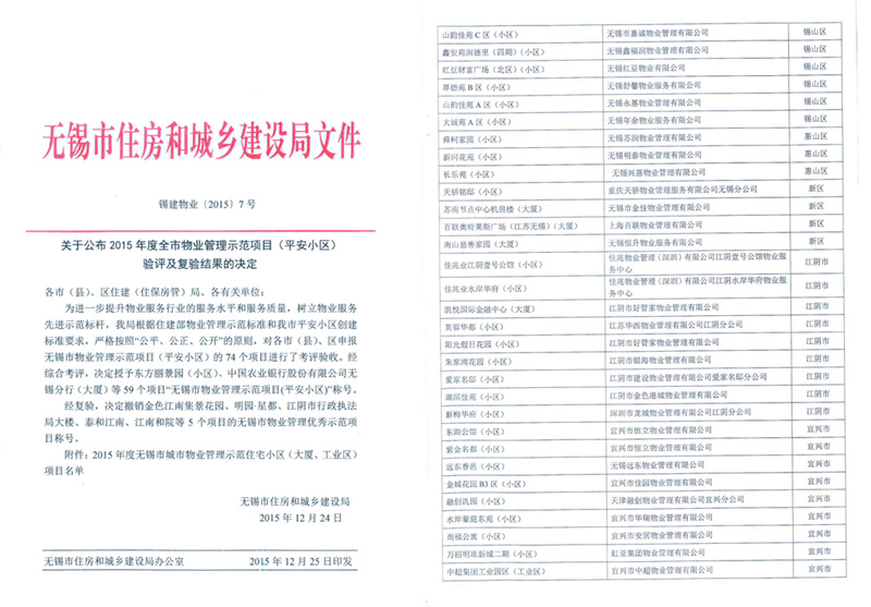 2015年3月根据无锡市住房局锡房物业(2015)1号、2号文件通知精神,中超物业管理有限公司开展了“物业管理服务达标”活动,“中超集团工业园区”被评选为无锡市物业管理示范项目(平安小区)。