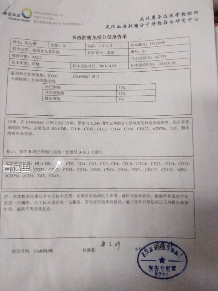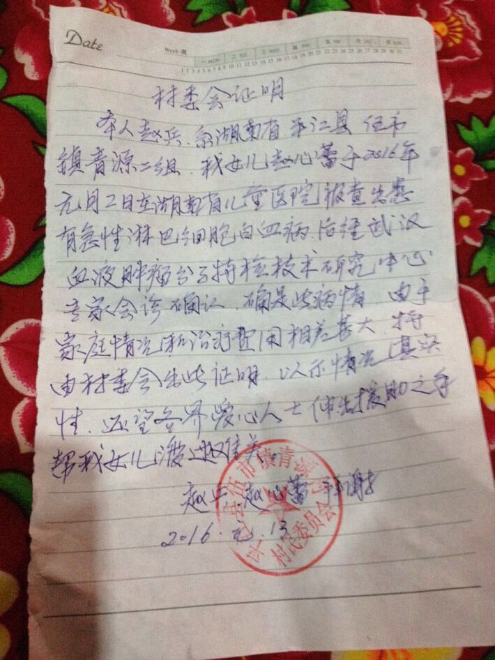 2016年1月2日,对于湖南省平江县伍市镇赵兵一家来说,是无比黑暗的一天,年仅3岁的孩子赵心蕾被确诊为急性淋巴细胞白血病。“急性淋巴细胞白血病”如积极配合治疗,大部分患儿可获得完全缓解,可是治疗过程繁琐、漫长,治疗耗资大,患儿一旦在治疗过程中停药随时会有新病灶的可能。赵兵没有固定工作,家中还有一个一岁多的女孩,平时做水电安装以维持一家四口的生计,面对二女儿赵心蕾巨额的治疗费,让本就捉襟见肘的赵兵一家更加手足无措,再次陷入困境。
