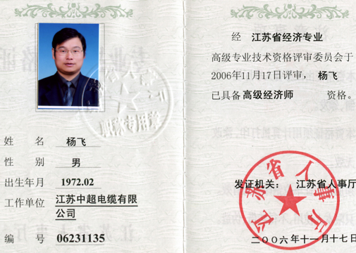 去年下半年,根据无锡市人事局和市工商联的文件精神,我们江苏中超电缆有限公司董事长兼总经理杨飞申报了“江苏省高级经济师”职称,经过严格的评审,最终被评定为“江苏省高级经济师”。作为此次参与评审的多名候选者中最年轻的企业家,杨飞凭借实力,最终当选也是名至实归。