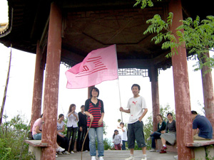 在团总支书记储旭的一声令下,男女青年开始向山顶进发。旗手苏善斌一直走在前面,“中超”大旗是我们的指引标志,引来了其它登山人的羡慕眼光。大家一边登山,一边呼吸着新鲜空气、欣赏着路两边的风景。山上路并不好走,大多是石子路,“世上本没有路,走的人多了也便成了路”成为我们前进的动力。每遇到一个亭子,大家都长松一口气,因为离山顶又近了一步,而略作休息后又继续向前。财务部的卞霞最有冲劲,第一个到达了山顶的凉亭,把众多男士都抛在了身后,堪称“女中豪杰”。在相互的鼓励与扶持下,大家陆陆续续地到了山顶,“中超”大旗在山顶随风飘扬。