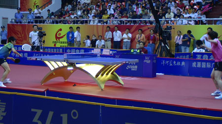第二场比赛是本场的焦点之战,由江苏队的姚彦对阵对方主将郭跃,这是一场国家队新锐与当今乒坛亚姐之间的对决。首局虽然双方比分就一直咬得很紧,但郭跃在后几个球上利用姚彦的抢攻失误,以11比8先胜。随后,姚彦第二局很好地控制住失误,很快以11比7扳回一局。